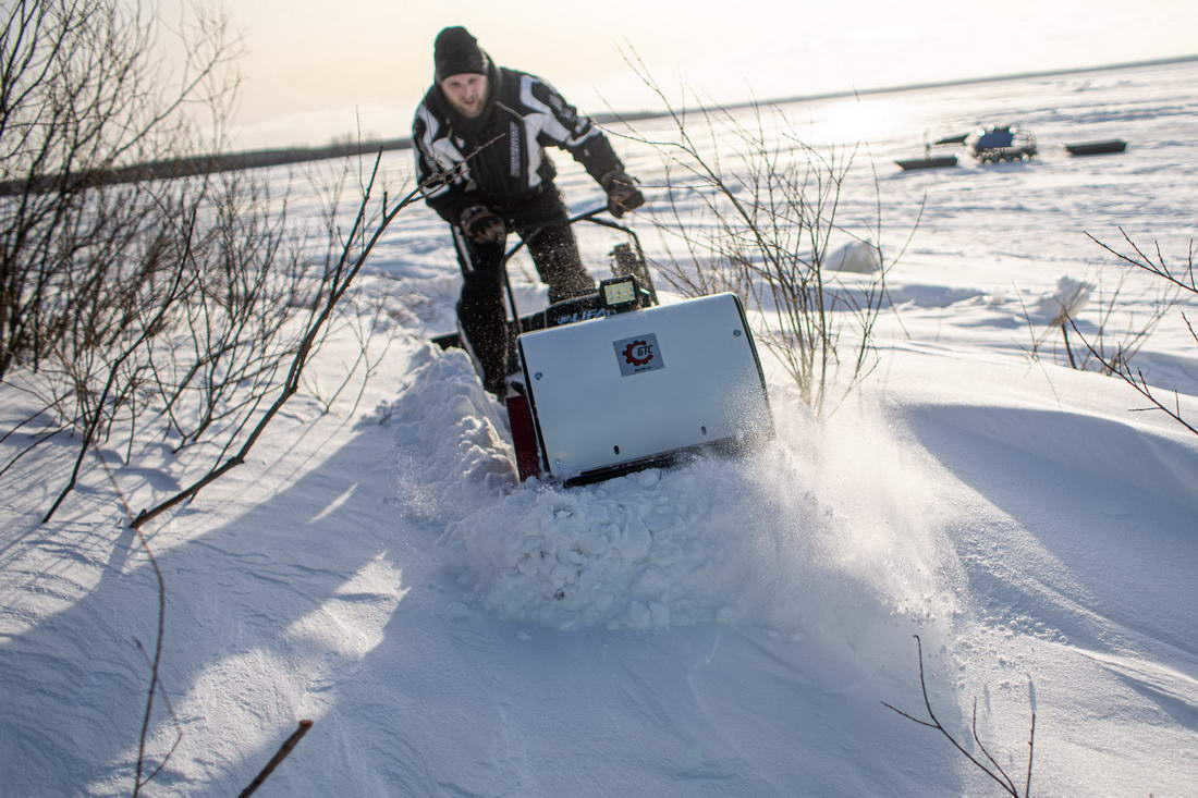 Модель оснащена гусеницей шириной 500 мм. Гусеница в сочетании с катковой подвеской способна проходить спокойно по льду и даже по территории без снега.