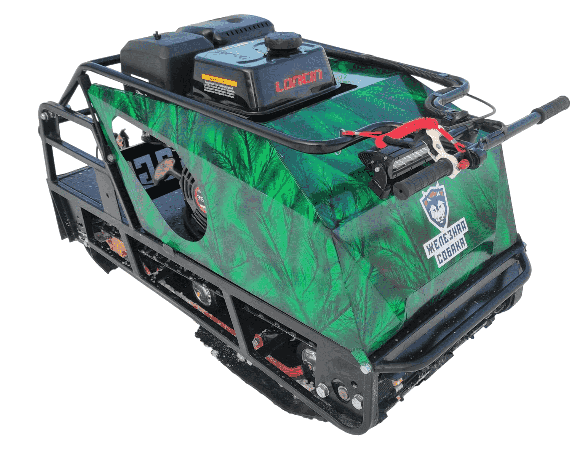 Мотособака весит 135 кг, а размер ее составляет 150 см в длину, 50 см в ширину и 74 см в высоту. Модель оснащена гусеницей шириной 500 мм. Гусеница в сочетании с катковой подвеской способна проходить спокойно по льду и даже по территории без снега.